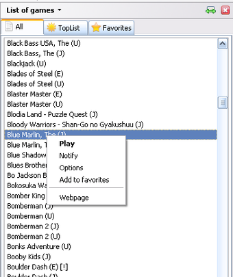 L'interface de FireNES se présente sous la forme d'une barre latérale et comporte 3 onglets: liste complète, tops (les plus populaires) et un troisième pour accueillir vos favoris.